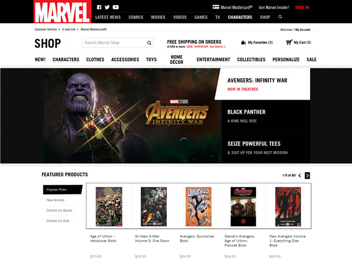 Marvel Shop is the official shop for all things Marvel, including Iron Man, Spider-Man, Hulk, Thor, Captain America, X-Men, and all your favorite superheroes. MarvelStore.com is Marvel’s premier retailer, providing a distinctive Marvel retail experience that encompasses all the best Marvel branded apparel, toys and electronics, and home décor. We are a unique destination for finding all the best Marvel products for the entire family, with a redesigned site offering an exceptional Guest experience.